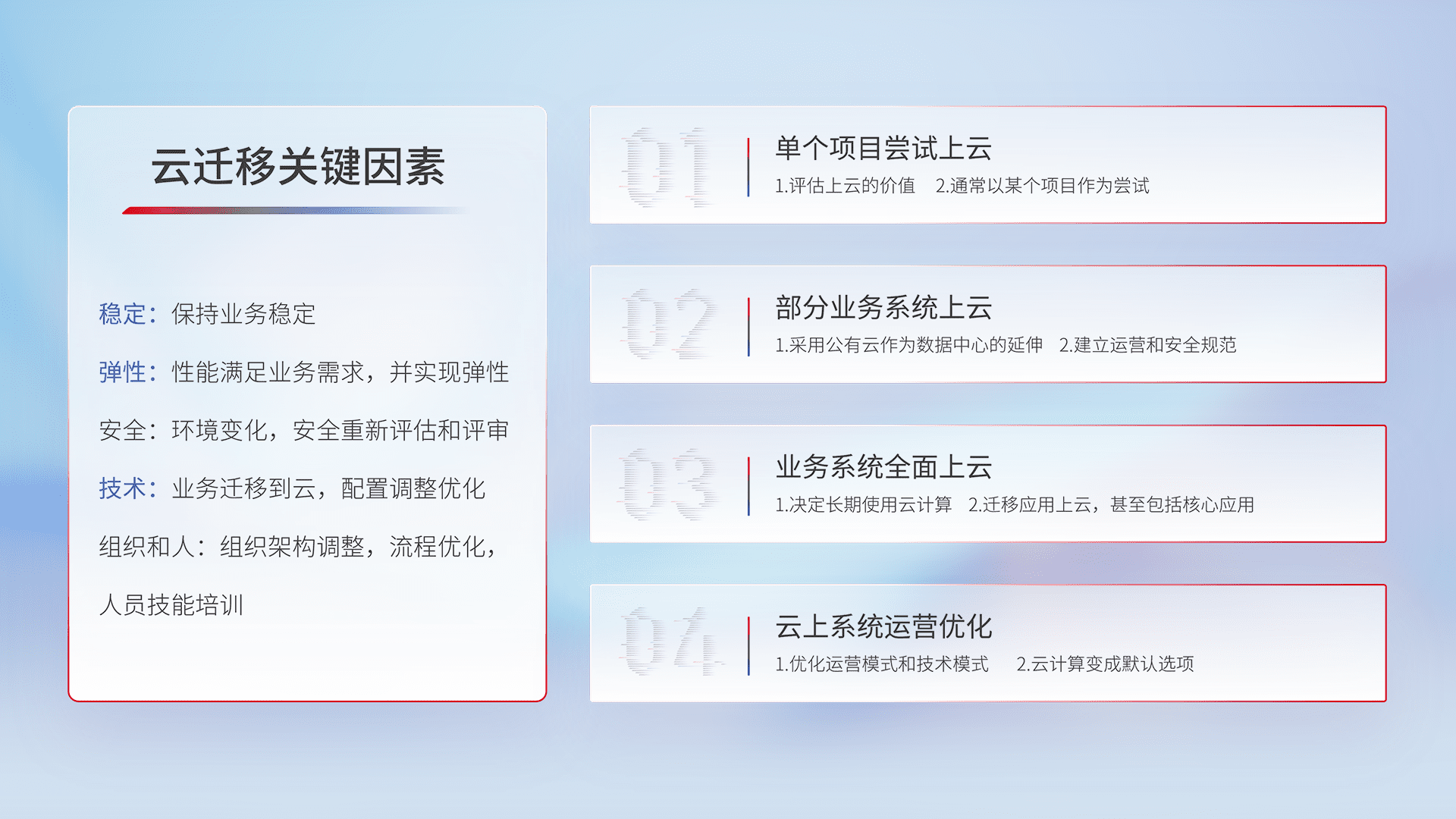 结合实际业务,,,,从规划设计、、、、云平台选型、、、云原生改造、、、数据迁移、、、集成交付,,迁移全过程为客户识别最佳上云路径,,做好风险识别管理,,设计网络架构、、、、身份权限、、、、安全审计合规、、、操作审计、、日志审计、、监控告警策略、、、多站点容灾设计等,,,,对云上基础设施进行整体规划,,,提升IT治理水平,,,以满足弹性、、、、高可用、、高性能的需求。。。