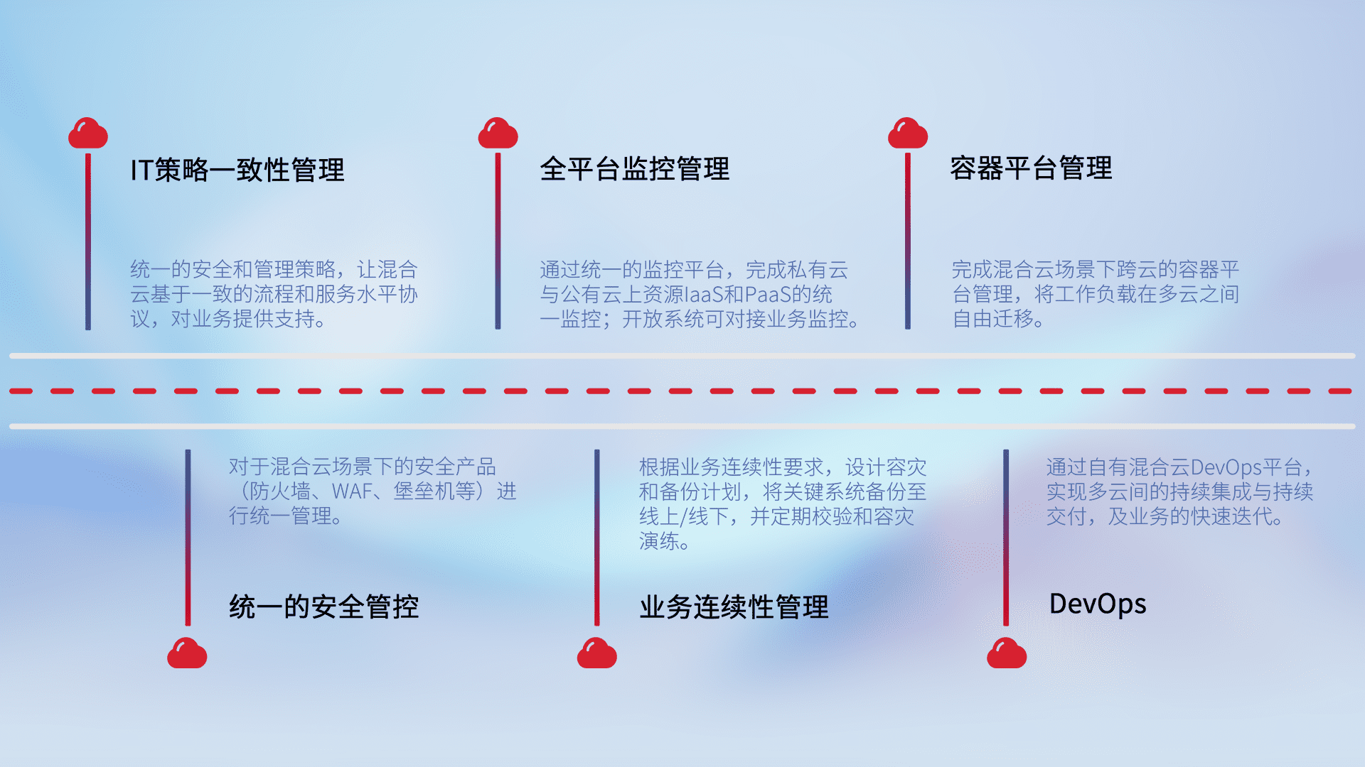 通过多云纳管,,以统一的资源数据模型把客户的云资源进行抽象和封装,,,进而实现对多云资源的统一操作,,,,保障云资源管理的可靠性、、、、稳定性与可用性。。。。量身定制化运维内容,,,配置、、、、开发运维、、、补丁管理、、备份、、监控、、、认证和访问管理、、审计和日常巡检等,,,保障在用云过程中的可靠度,,,稳定度以及高可用率。。。。